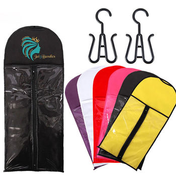 Nueva llegada logotipo personalizado no tejido a prueba de polvo embalaje extensiones de cabello peluca bolsa de almacenamiento con colgador de plástico